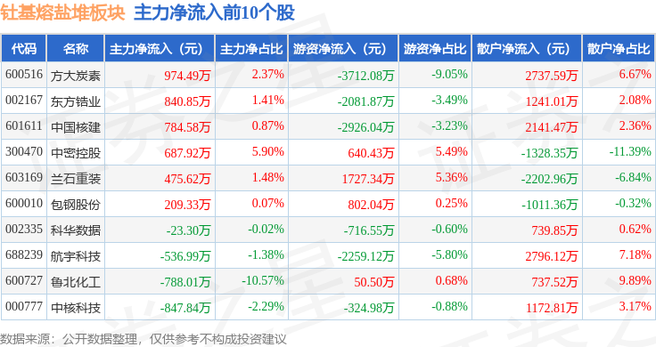 从资金流向上来看,当日钍基熔盐堆板块主力资金净流出6.71亿元,游资资金净流出1.95亿元,散户资金净流入8.66亿元。钍基熔盐堆板块个股资金流向见下表: