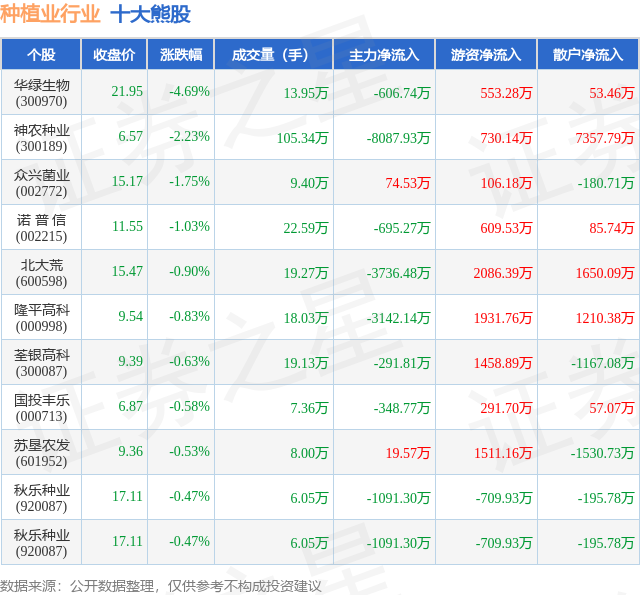 个股表现方面,种植业行业当日领跌股为华绿生物(300970),该股当日报收21.95,下跌4.69%,成交量13.95万,主力资金净流出606.74万元。神农种业(300189)以下跌2.23%紧随其后,该股当日成交量105.34万,主力资金净流出8087.93万元。除此之外,众兴菌业(002772)、诺 普 信(002215)、北大荒(600598)均进入当日熊股之列。具体个股列表见下表: