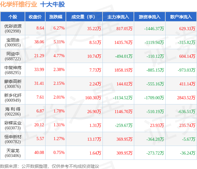 个股表现方面,化学纤维行业当日领涨股为优彩资源(002998),该股当日报收8.64,上涨6.27%,成交量35.22万,主力资金净流入817.05万元。宝丽迪(300905)以上涨5.11%紧随其后,该股当日成交量8.51万,主力资金净流入1435.76万元。除此之外,同益中(688722)、中复神鹰(688295)、蒙泰高新(300876)均进入当日牛股之列。具体个股列表见下表: