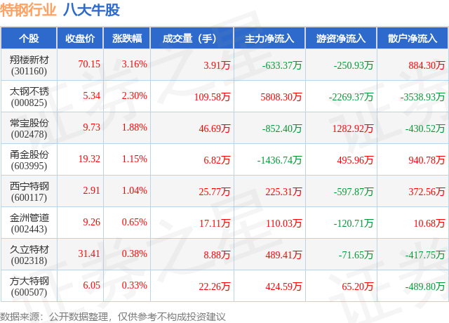 个股表现方面,特钢行业当日领涨股为翔楼新材(301160),该股当日报收70.15,上涨3.16%,成交量3.91万,主力资金净流出633.37万元。太钢不锈(000825)以上涨2.3%紧随其后,该股当日成交量109.58万,主力资金净流入5808.3万元。除此之外,常宝股份(002478)、甬金股份(603995)、西宁特钢(600117)均进入当日牛股之列。具体个股列表见下表: