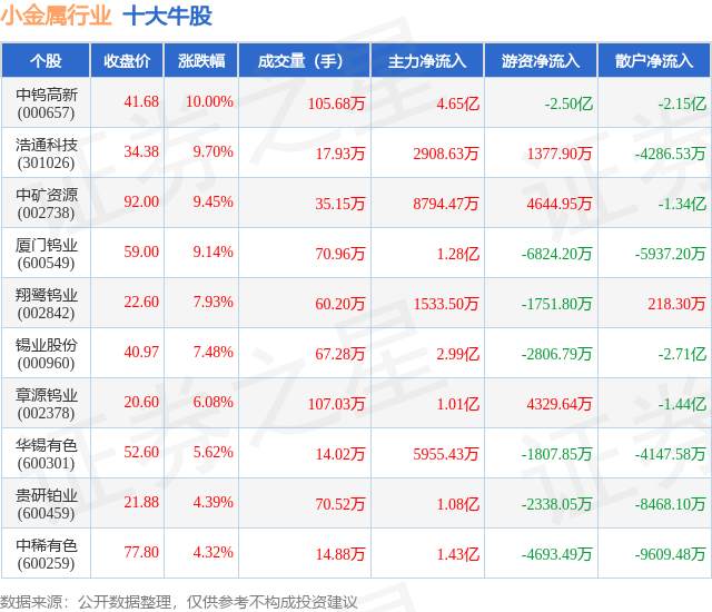 个股表现方面,小金属行业当日领涨股为中钨高新(000657),该股当日报收41.68,上涨10.0%,成交量105.68万,主力资金净流入4.65亿元。浩通科技(301026)以上涨9.7%紧随其后,该股当日成交量17.93万,主力资金净流入2908.63万元。除此之外,中矿资源(002738)、厦门钨业(600549)、翔鹭钨业(002842)均进入当日牛股之列。具体个股列表见下表: