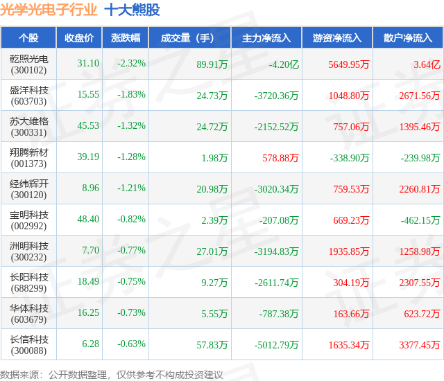 个股表现方面,光学光电子行业当日领跌股为乾照光电(300102),该股当日报收31.1,下跌2.32%,成交量89.91万,主力资金净流出4.2亿元。盛洋科技(603703)以下跌1.83%紧随其后,该股当日成交量24.73万,主力资金净流出3720.36万元。除此之外,苏大维格(300331)、翔腾新材(001373)、经纬辉开(300120)均进入当日熊股之列。具体个股列表见下表: