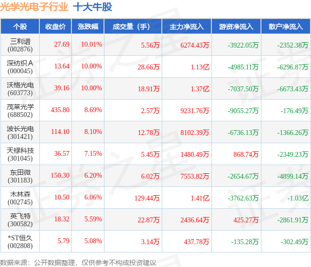 个股表现方面,光学光电子行业当日领涨股为三利谱(002876),该股当日报收27.69,上涨10.01%,成交量5.56万,主力资金净流入6274.43万元。深纺织A(000045)以上涨10.0%紧随其后,该股当日成交量28.66万,主力资金净流入1.13亿元。除此之外,沃格光电(603773)、茂莱光学(688502)、波长光电(301421)均进入当日牛股之列。具体个股列表见下表: