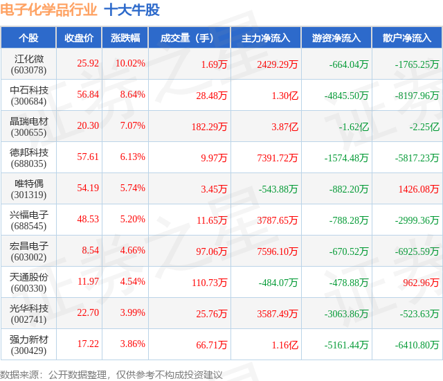 个股表现方面,电子化学品行业当日领涨股为江化微(603078),该股当日报收25.92,上涨10.02%,成交量1.69万,主力资金净流入2429.29万元。中石科技(300684)以上涨8.64%紧随其后,该股当日成交量28.48万,主力资金净流入1.3亿元。除此之外,晶瑞电材(300655)、德邦科技(688035)、唯特偶(301319)均进入当日牛股之列。具体个股列表见下表:
