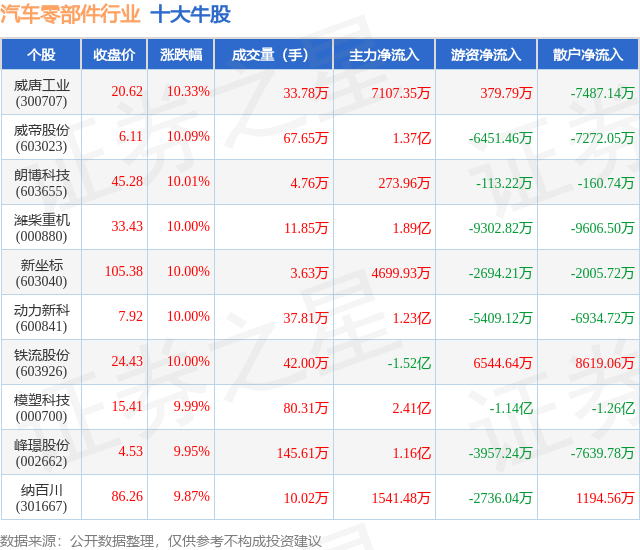 个股表现方面,汽车零部件行业当日领涨股为威唐工业(300707),该股当日报收20.62,上涨10.33%,成交量33.78万,主力资金净流入7107.35万元。威帝股份(603023)以上涨10.09%紧随其后,该股当日成交量67.65万,主力资金净流入1.37亿元。除此之外,朗博科技(603655)、潍柴重机(000880)、新坐标(603040)均进入当日牛股之列。具体个股列表见下表: