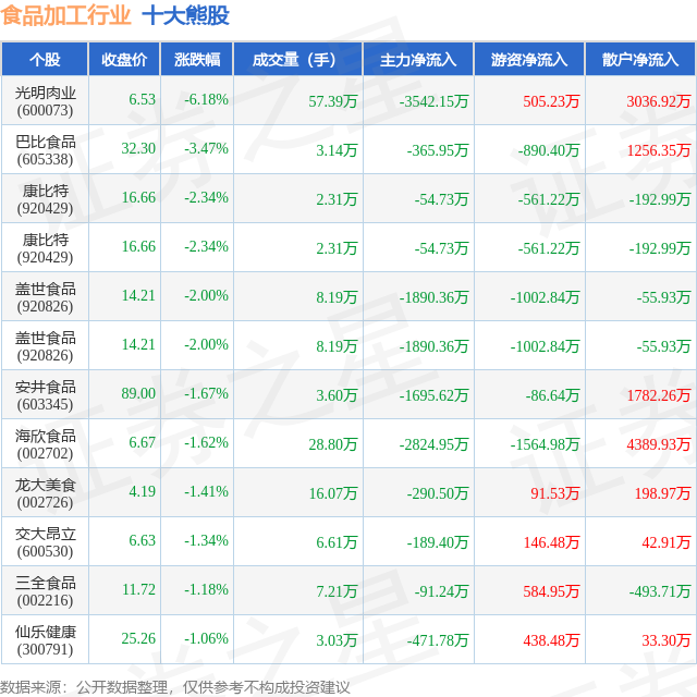 个股表现方面,食品加工行业当日领跌股为光明肉业(600073),该股当日报收6.53,下跌6.18%,成交量57.39万,主力资金净流出3542.15万元。巴比食品(605338)以下跌3.47%紧随其后,该股当日成交量3.14万,主力资金净流出365.95万元。除此之外,康比特(920429)、康比特(920429)、盖世食品(920826)均进入当日熊股之列。具体个股列表见下表: