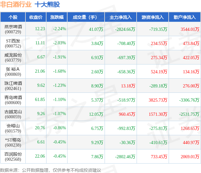 个股表现方面,非白酒行业当日领跌股为燕京啤酒(000729),该股当日报收12.23,下跌2.24%,成交量41.07万,主力资金净流出2824.66万元。ST西发(000752)以下跌2.03%紧随其后,该股当日成交量3.84万,主力资金净流出708.4万元。除此之外,威龙股份(603779)、张 裕A(000869)、珠江啤酒(002461)均进入当日熊股之列。具体个股列表见下表: