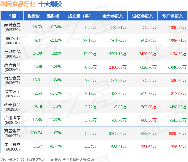 个股表现方面,休闲食品行业当日领跌股为南侨食品(605339),该股当日报收18.53,下跌6.74%,成交量6.34万,主力资金净流出1523.91万元。黑芝麻(000716)以下跌2.12%紧随其后,该股当日成交量35.15万,主力资金净流出1301.64万元。除此之外,三只松鼠(300783)、洽洽食品(002557)、有友食品(603697)均进入当日熊股之列。具体个股列表见下表: