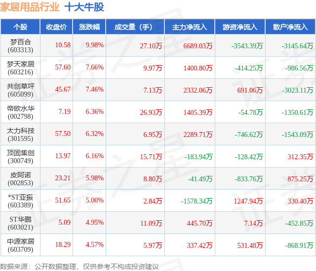 个股表现方面,家居用品行业当日领涨股为梦百合(603313),该股当日报收10.58,上涨9.98%,成交量27.1万,主力资金净流入6689.03万元。梦天家居(603216)以上涨7.66%紧随其后,该股当日成交量9.97万,主力资金净流入1400.8万元。除此之外,共创草坪(605099)、帝欧水华(002798)、太力科技(301595)均进入当日牛股之列。具体个股列表见下表: