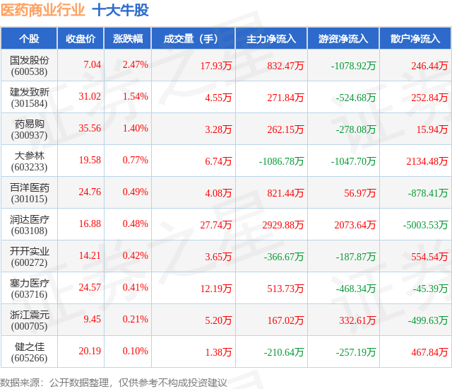 个股表现方面,医药商业行业当日领涨股为国发股份(600538),该股当日报收7.04,上涨2.47%,成交量17.93万,主力资金净流入832.47万元。建发致新(301584)以上涨1.54%紧随其后,该股当日成交量4.55万,主力资金净流入271.84万元。除此之外,药易购(300937)、大参林(603233)、百洋医药(301015)均进入当日牛股之列。具体个股列表见下表: