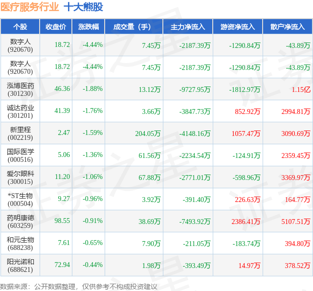 个股表现方面,医疗服务行业当日领跌股为数字人(920670),该股当日报收18.72,下跌4.44%,成交量7.45万,主力资金净流出2187.39万元。数字人(920670)以下跌4.44%紧随其后,该股当日成交量7.45万,主力资金净流出2187.39万元。除此之外,泓博医药(301230)、诚达药业(301201)、新里程(002219)均进入当日熊股之列。具体个股列表见下表: