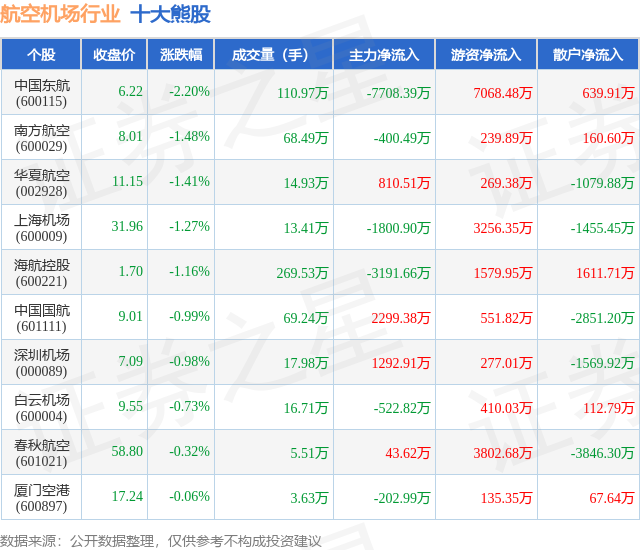 个股表现方面,航空机场行业当日领跌股为中国东航(600115),该股当日报收6.22,下跌2.2%,成交量110.97万,主力资金净流出7708.39万元。南方航空(600029)以下跌1.48%紧随其后,该股当日成交量68.49万,主力资金净流出400.49万元。除此之外,华夏航空(002928)、上海机场(600009)、海航控股(600221)均进入当日熊股之列。具体个股列表见下表:
