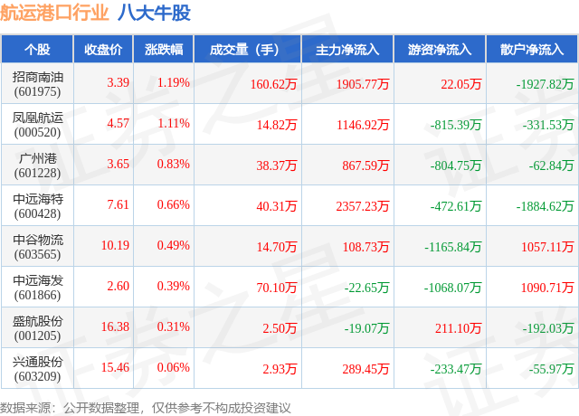个股表现方面,航运港口行业当日领涨股为招商南油(601975),该股当日报收3.39,上涨1.19%,成交量160.62万,主力资金净流入1905.77万元。凤凰航运(000520)以上涨1.11%紧随其后,该股当日成交量14.82万,主力资金净流入1146.92万元。除此之外,广州港(601228)、中远海特(600428)、中谷物流(603565)均进入当日牛股之列。具体个股列表见下表: