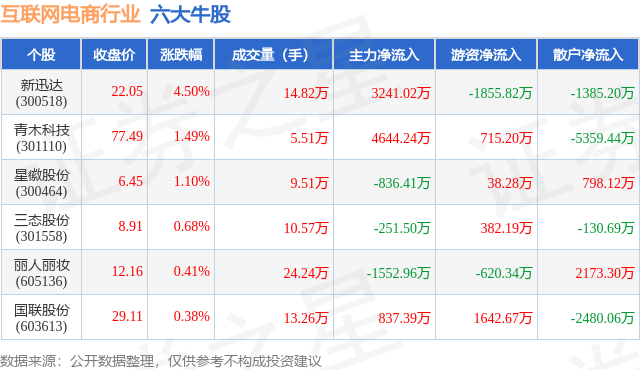 个股表现方面,互联网电商行业当日领涨股为新迅达(300518),该股当日报收22.05,上涨4.5%,成交量14.82万,主力资金净流入3241.02万元。青木科技(301110)以上涨1.49%紧随其后,该股当日成交量5.51万,主力资金净流入4644.24万元。除此之外,星徽股份(300464)、三态股份(301558)、丽人丽妆(605136)均进入当日牛股之列。具体个股列表见下表: