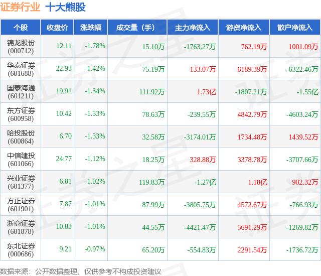 个股表现方面,证券行业当日领跌股为锦龙股份(000712),该股当日报收12.11,下跌1.78%,成交量15.1万,主力资金净流出1763.27万元。华泰证券(601688)以下跌1.42%紧随其后,该股当日成交量75.19万,主力资金净流入133.07万元。除此之外,国泰海通(601211)、东方证券(600958)、哈投股份(600864)均进入当日熊股之列。具体个股列表见下表: