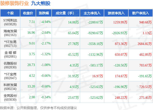 个股表现方面,装修装饰行业当日领跌股为ST柯利达(603828),该股当日报收7.51,下跌4.94%,成交量14.0万,主力资金净流出2200.67万元。海南发展(002163)以下跌2.64%紧随其后,该股当日成交量65.04万,主力资金净流出9290.67万元。除此之外,*ST东易(002713)、金 螳 螂(002081)、名雕股份(002830)均进入当日熊股之列。具体个股列表见下表:
