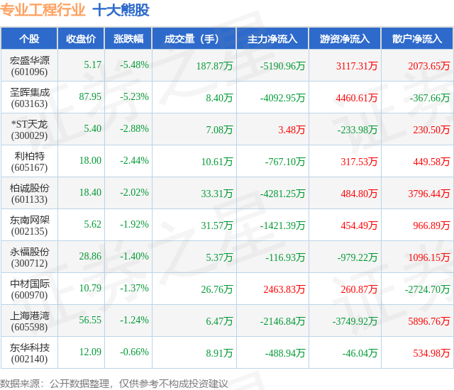 个股表现方面,专业工程行业当日领跌股为宏盛华源(601096),该股当日报收5.17,下跌5.48%,成交量187.87万,主力资金净流出5190.96万元。圣晖集成(603163)以下跌5.23%紧随其后,该股当日成交量8.4万,主力资金净流出4092.95万元。除此之外,*ST天龙(300029)、利柏特(605167)、柏诚股份(601133)均进入当日熊股之列。具体个股列表见下表: