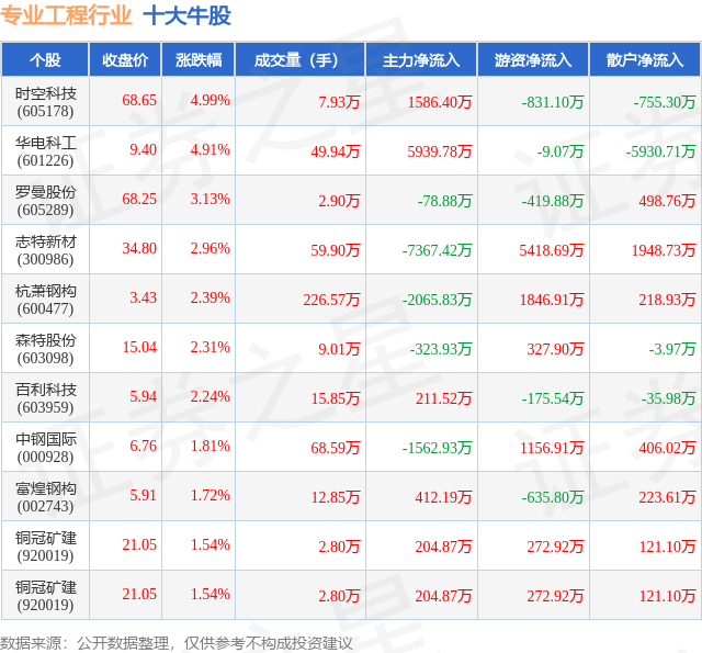个股表现方面,专业工程行业当日领涨股为时空科技(605178),该股当日报收68.65,上涨4.99%,成交量7.93万,主力资金净流入1586.4万元。华电科工(601226)以上涨4.91%紧随其后,该股当日成交量49.94万,主力资金净流入5939.78万元。除此之外,罗曼股份(605289)、志特新材(300986)、杭萧钢构(600477)均进入当日牛股之列。具体个股列表见下表: