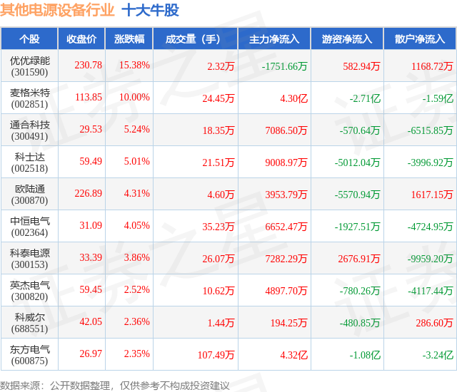 个股表现方面,其他电源设备行业当日领涨股为优优绿能(301590),该股当日报收230.78,上涨15.38%,成交量2.32万,主力资金净流出1751.66万元。麦格米特(002851)以上涨10.0%紧随其后,该股当日成交量24.45万,主力资金净流入4.3亿元。除此之外,通合科技(300491)、科士达(002518)、欧陆通(300870)均进入当日牛股之列。具体个股列表见下表: