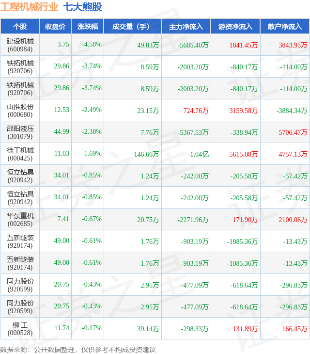 个股表现方面,工程机械行业当日领跌股为建设机械(600984),该股当日报收3.75,下跌4.58%,成交量49.83万,主力资金净流出5685.4万元。铁拓机械(920706)以下跌3.74%紧随其后,该股当日成交量8.59万,主力资金净流出2003.2万元。除此之外,铁拓机械(920706)、山推股份(000680)、邵阳液压(301079)均进入当日熊股之列。具体个股列表见下表: