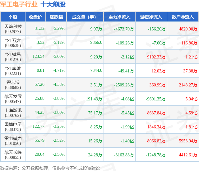 个股表现方面,军工电子行业当日领跌股为天箭科技(002977),该股当日报收31.32,下跌5.29%,成交量9.97万,主力资金净流出4673.7万元。*ST万方(000638)以下跌5.12%紧随其后,该股当日成交量9866.0,主力资金净流出109.26万元。除此之外,*ST铖昌(001270)、*ST奥维(002231)、霍莱沃(688682)均进入当日熊股之列。具体个股列表见下表: