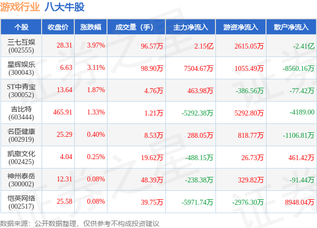 个股表现方面,游戏行业当日领涨股为三七互娱(002555),该股当日报收28.31,上涨3.97%,成交量96.57万,主力资金净流入2.15亿元。星辉娱乐(300043)以上涨3.11%紧随其后,该股当日成交量98.9万,主力资金净流入7504.67万元。除此之外,ST中青宝(300052)、吉比特(603444)、名臣健康(002919)均进入当日牛股之列。具体个股列表见下表: