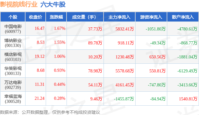 个股表现方面,影视院线行业当日领涨股为中国电影(600977),该股当日报收16.47,上涨1.67%,成交量37.73万,主力资金净流入5832.41万元。博纳影业(001330)以上涨1.55%紧随其后,该股当日成交量89.78万,主力资金净流入918.11万元。除此之外,横店影视(603103)、华策影视(300133)、万达电影(002739)均进入当日牛股之列。具体个股列表见下表: