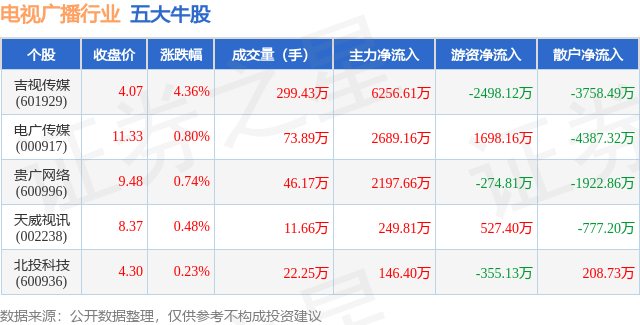 个股表现方面,电视广播行业当日领涨股为吉视传媒(601929),该股当日报收4.07,上涨4.36%,成交量299.43万,主力资金净流入6256.61万元。电广传媒(000917)以上涨0.8%紧随其后,该股当日成交量73.89万,主力资金净流入2689.16万元。除此之外,贵广网络(600996)、天威视讯(002238)、北投科技(600936)均进入当日牛股之列。具体个股列表见下表: