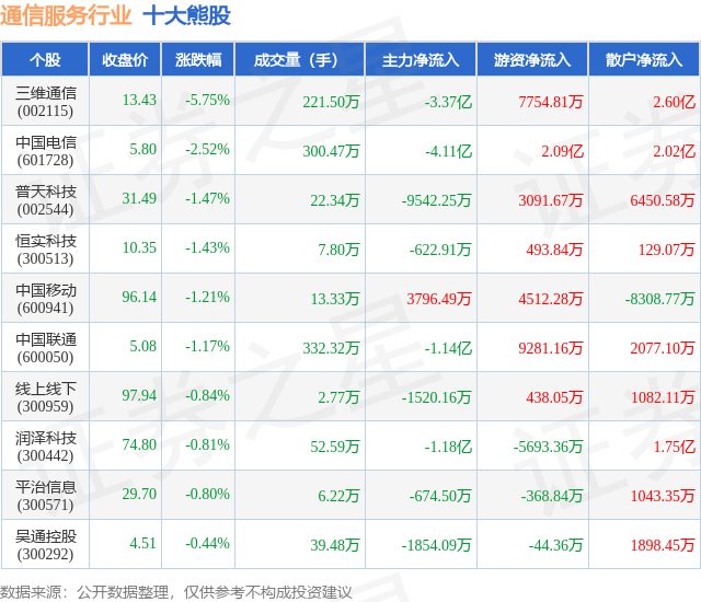 个股表现方面,通信服务行业当日领跌股为三维通信(002115),该股当日报收13.43,下跌5.75%,成交量221.5万,主力资金净流出3.37亿元。中国电信(601728)以下跌2.52%紧随其后,该股当日成交量300.47万,主力资金净流出4.11亿元。除此之外,普天科技(002544)、恒实科技(300513)、中国移动(600941)均进入当日熊股之列。具体个股列表见下表:
