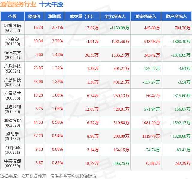 个股表现方面,通信服务行业当日领涨股为纵横通信(603602),该股当日报收16.28,上涨2.71%,成交量17.62万,主力资金净流出1150.09万元。挖金客(301380)以上涨2.29%紧随其后,该股当日成交量4.91万,主力资金净流入1281.46万元。除此之外,恒信东方(300081)、广脉科技(920924)、广脉科技(920924)均进入当日牛股之列。具体个股列表见下表: