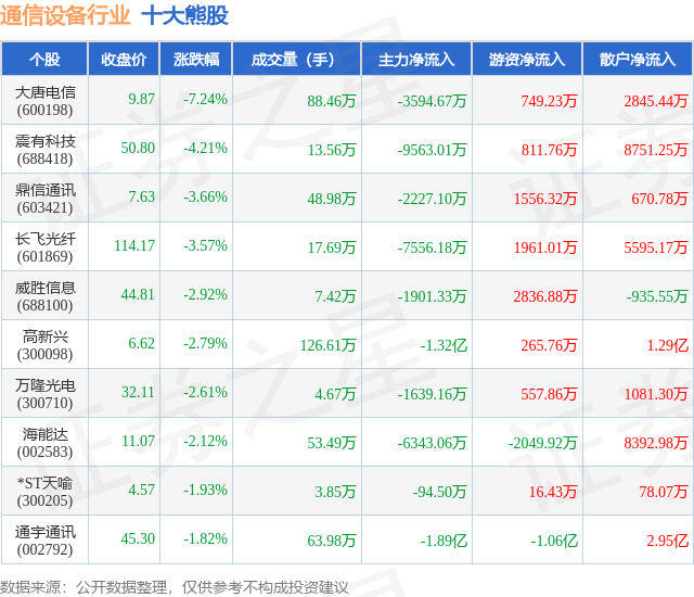 个股表现方面,通信设备行业当日领跌股为大唐电信(600198),该股当日报收9.87,下跌7.24%,成交量88.46万,主力资金净流出3594.67万元。震有科技(688418)以下跌4.21%紧随其后,该股当日成交量13.56万,主力资金净流出9563.01万元。除此之外,鼎信通讯(603421)、长飞光纤(601869)、威胜信息(688100)均进入当日熊股之列。具体个股列表见下表: