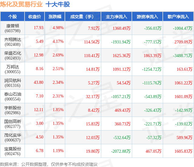 个股表现方面,炼化及贸易行业当日领涨股为康普顿(603798),该股当日报收17.93,上涨4.98%,成交量7.92万,主力资金净流入1360.49万元。齐翔腾达(002408)以上涨4.17%紧随其后,该股当日成交量114.56万,主力资金净流出1931.94万元。除此之外,荣盛石化(002493)、万邦达(300055)、润贝航科(001316)均进入当日牛股之列。具体个股列表见下表: