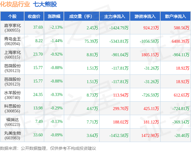 个股表现方面,化妆品行业当日领跌股为嘉亨家化(300955),该股当日报收37.69,下跌2.13%,成交量2.45万,主力资金净流出1424.79万元。青岛金王(002094)以下跌1.44%紧随其后,该股当日成交量75.39万,主力资金净流出5343.81万元。除此之外,上海家化(600315)、芭薇股份(920123)、芭薇股份(920123)均进入当日熊股之列。具体个股列表见下表: