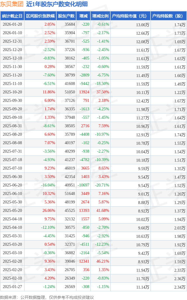 从股价来看,2026年1月10日至2026年1月20日,东贝集团区间涨幅为2.05%,在此期间股东户数减少220.0户,减幅为0.61%。