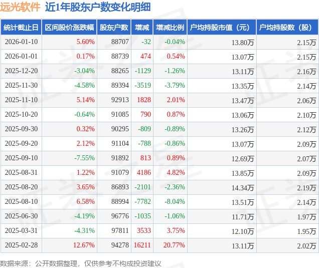 从股价来看,2026年1月1日至2026年1月10日,远光软件区间涨幅为5.6%,在此期间股东户数减少32.0户,减幅为0.04%。