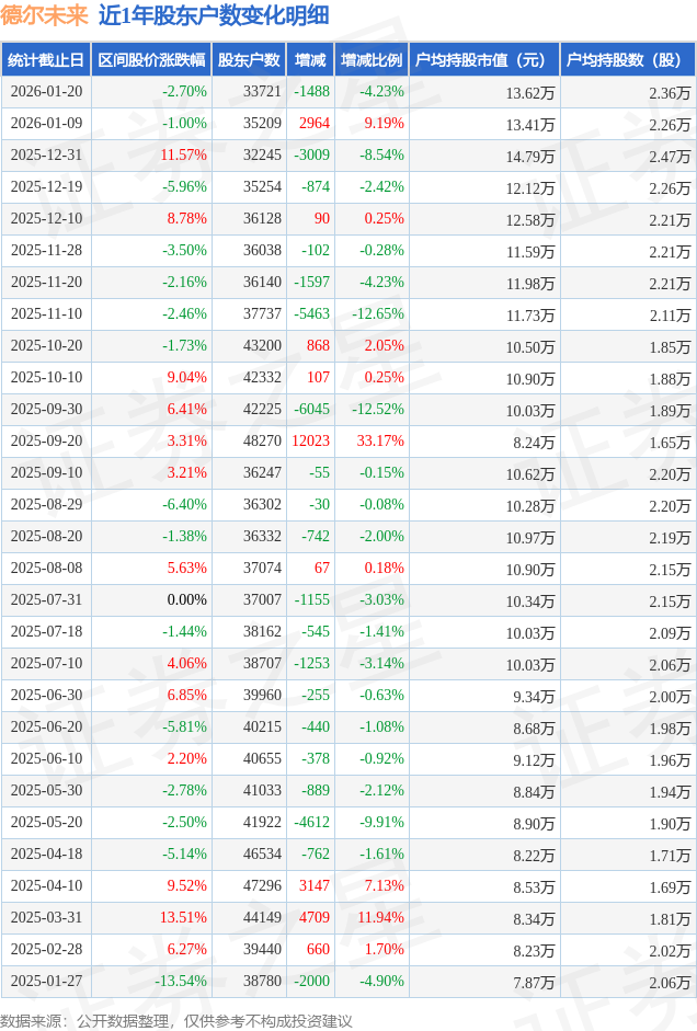 从股价来看,2026年1月9日至2026年1月20日,德尔未来区间跌幅为2.7%,在此期间股东户数减少1488.0户,减幅为4.23%。