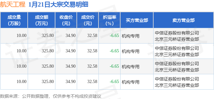 证券之星消息,1月21日航天工程发生大宗交易,交易数据如下: