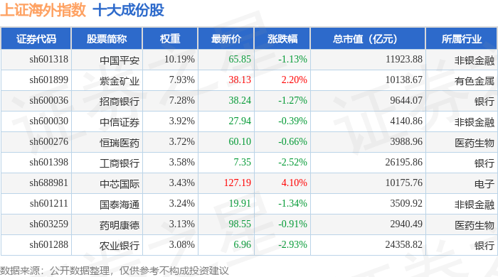 证券之星消息,1月21日,上证海外(000054)指数报收于1612.49点,跌0.46%,成交1275.99亿元,换手率0.42%。当日该指数成份股中,上涨的有12家,山东黄金以8.2%的涨幅领涨,下跌的有56家,中信银行以3.06%的跌幅领跌。