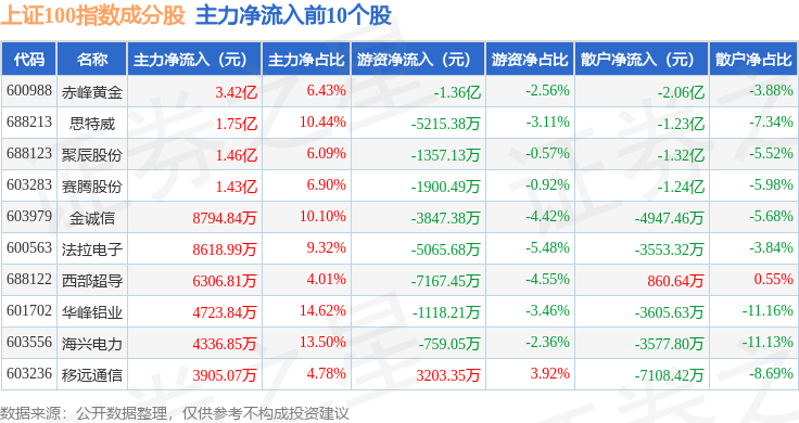 资金流向方面,上证100(000132)指数成份股当日主力资金净流入合计105.97万元,游资资金净流出合计2.92亿元,散户资金净流入合计2.91亿元。成份股资金流向详情见下表:
