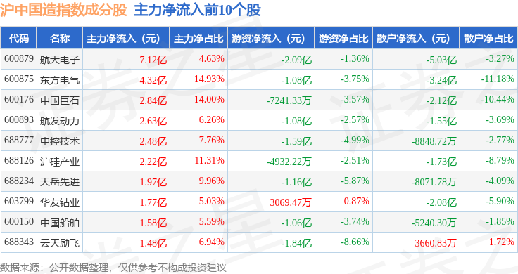 资金流向方面,沪中国造(000161)指数成份股当日主力资金净流出合计11.05亿元,游资资金净流出合计6.6亿元,散户资金净流入合计17.65亿元。成份股资金流向详情见下表: