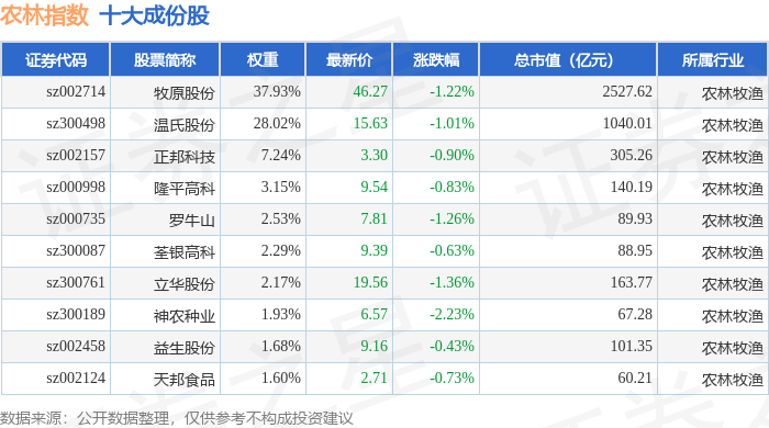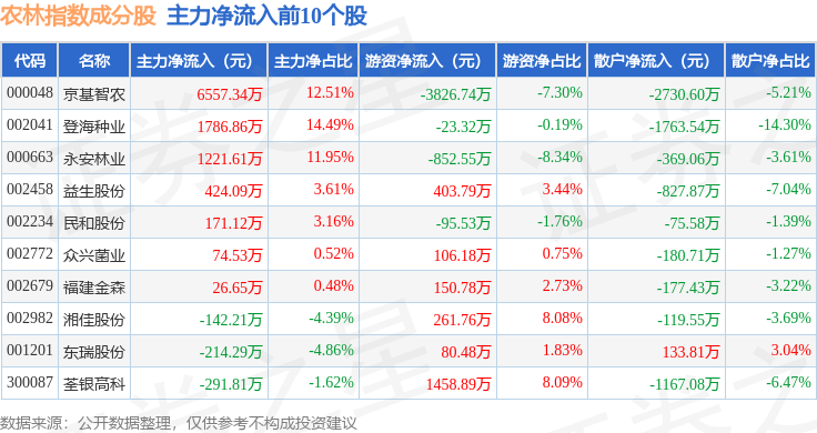 资金流向方面,农林指数(399231)成份股当日主力资金净流出合计3.1亿元,游资资金净流入合计2985.29万元,散户资金净流入合计2.8亿元。成份股资金流向详情见下表:
