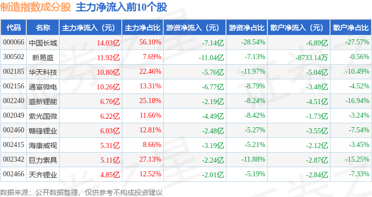 资金流向方面,制造指数(399233)成份股当日主力资金净流入合计50.06亿元,游资资金净流出合计143.2亿元,散户资金净流入合计93.14亿元。成份股资金流向详情见下表: