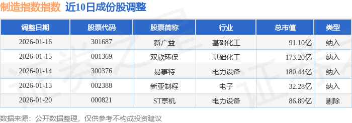 近10日内制造指数(399233)成份股做了调整,新纳入了4只股票,剔除了1只股票。