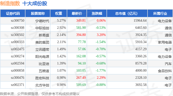 制造指数(399233)十大成份股详情如下: