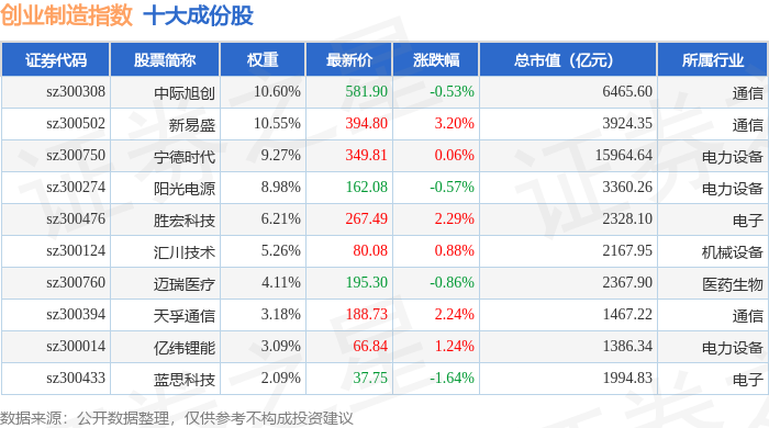 创业制造(399261)指数十大成份股详情如下: