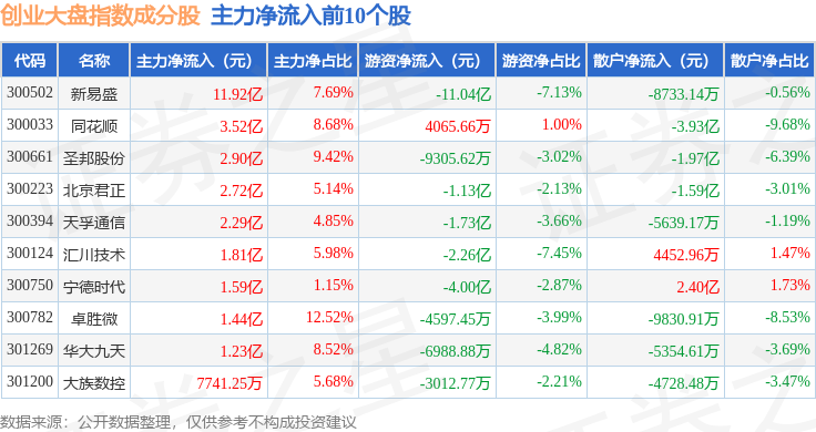 资金流向方面,创业大盘(399293)指数成份股当日主力资金净流入合计2.36亿元,游资资金净流出合计15.13亿元,散户资金净流入合计12.76亿元。成份股资金流向详情见下表: