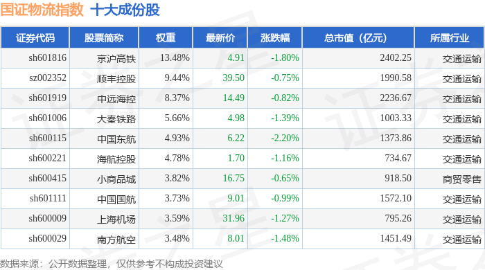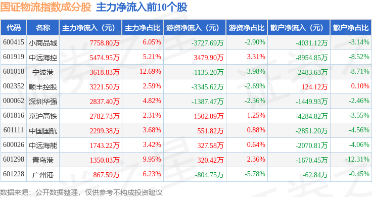 资金流向方面,国证物流(399353)指数成份股当日主力资金净流出合计7.35亿元,游资资金净流入合计4.61亿元,散户资金净流入合计2.74亿元。成份股资金流向详情见下表:
