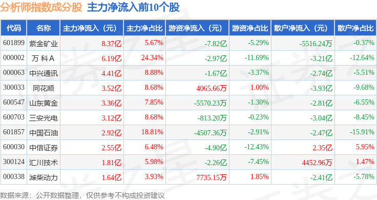 资金流向方面,分析师指数(399354)成份股当日主力资金净流出合计3.09亿元,游资资金净流出合计21.77亿元,散户资金净流入合计24.85亿元。成份股资金流向详情见下表: