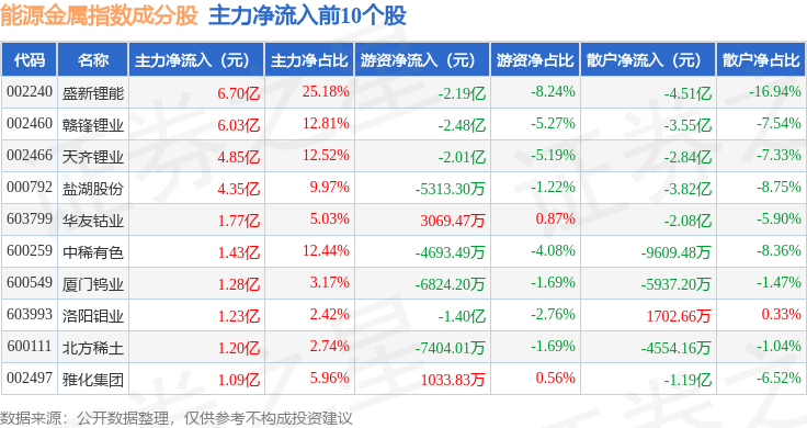 资金流向方面,能源金属(399366)指数成份股当日主力资金净流入合计34.08亿元,游资资金净流出合计14.91亿元,散户资金净流出合计19.1亿元。成份股资金流向详情见下表: