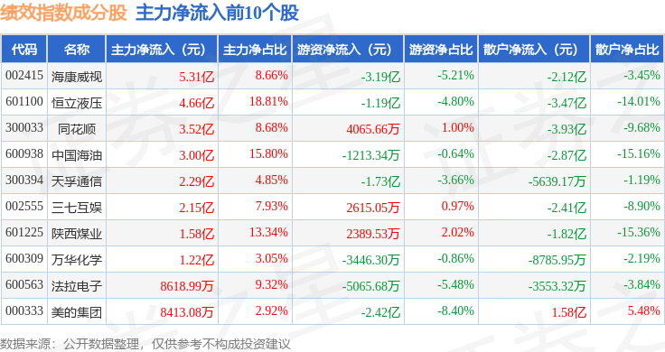 资金流向方面,绩效指数(399398)成份股当日主力资金净流入合计1.56亿元,游资资金净流入合计5.22亿元,散户资金净流出合计6.78亿元。成份股资金流向详情见下表: